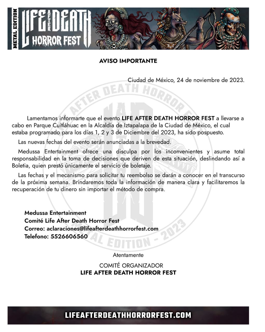 *Nota anterior fechada con 19 de nobiembre* El festival Life After Death Horror Fest se desarrollará os días 1, 2 y 3 de diciembre en el Área Federal Parque Cuitláhuac, ubicado en Santa Cruz Meyehualco, Iztapalapa.