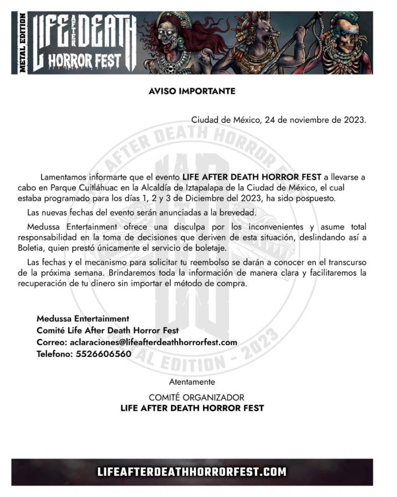 A un par de semanas de su realización, los organizadores del festival de metal Life After Death Horror Fest anunciaron la posposición del mismo, debido a la imposibilidad de asegurar un venue para su desarrollo.