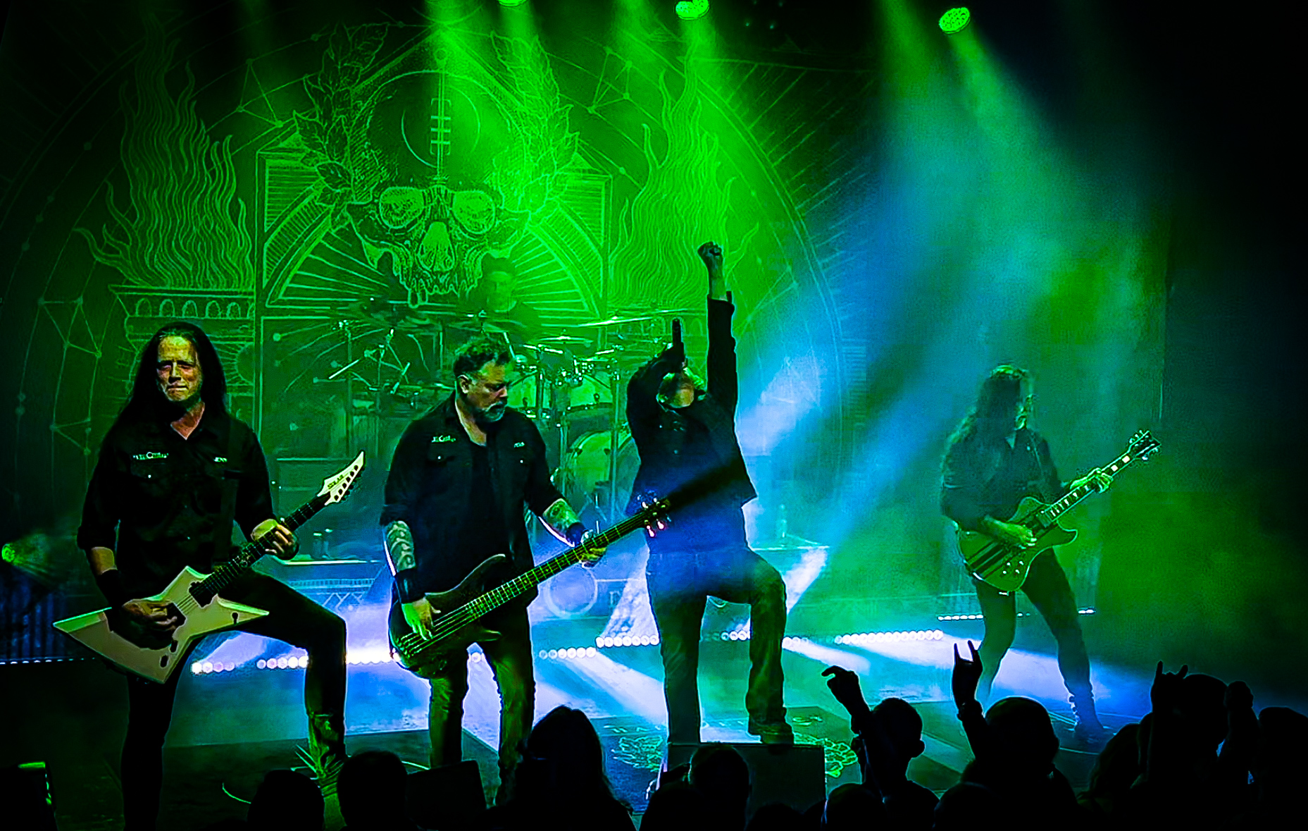 Tras una hora de un show que no escatimó en energía y dejando a la audiencia con la adrenalina en su punto, Bloodred Hourglass dio paso a sus colegas nórdicos. Con apenas 15 minutos de respiro, el público recibió el aviso de la triunfal entrada al escenario de The Halo Effect, el recinto se pintó de un verde intenso y cada músico fue tomando su sitio mientras se escuchaba una pista de intro.