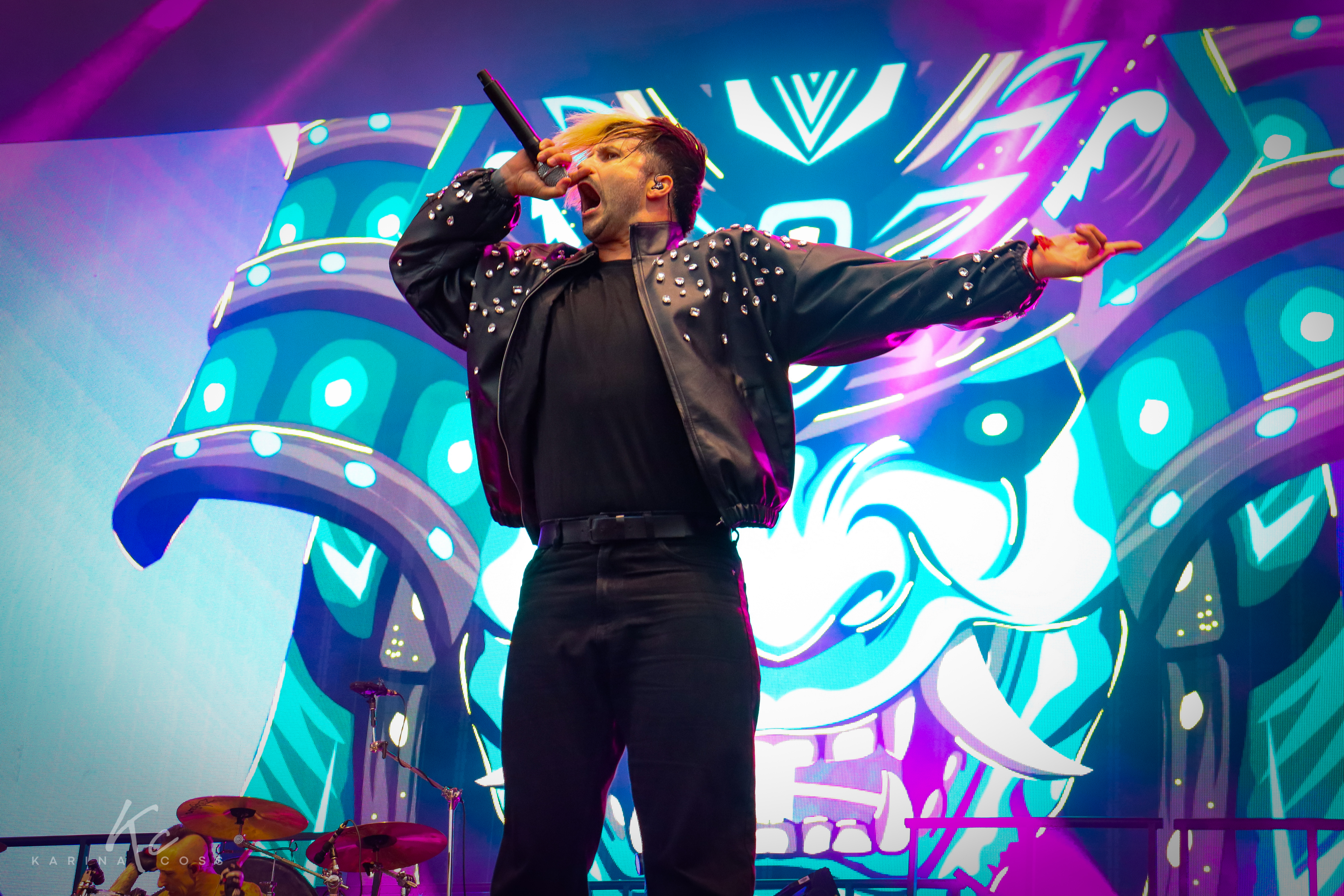 The visuals alone were a show: giant arcade machines on stage that the guitarists climbed to shred impossible solos from above. Their playful chemistry —running, posing, throwing winks at the crowd— turned the set into something hyperactive and hilarious, like watching a Street Fighter round fought between inflatable dragons. It was impossible not to enjoy their technical speed mixed with theatrical humor (including a plush chicken that went crowd surfing).