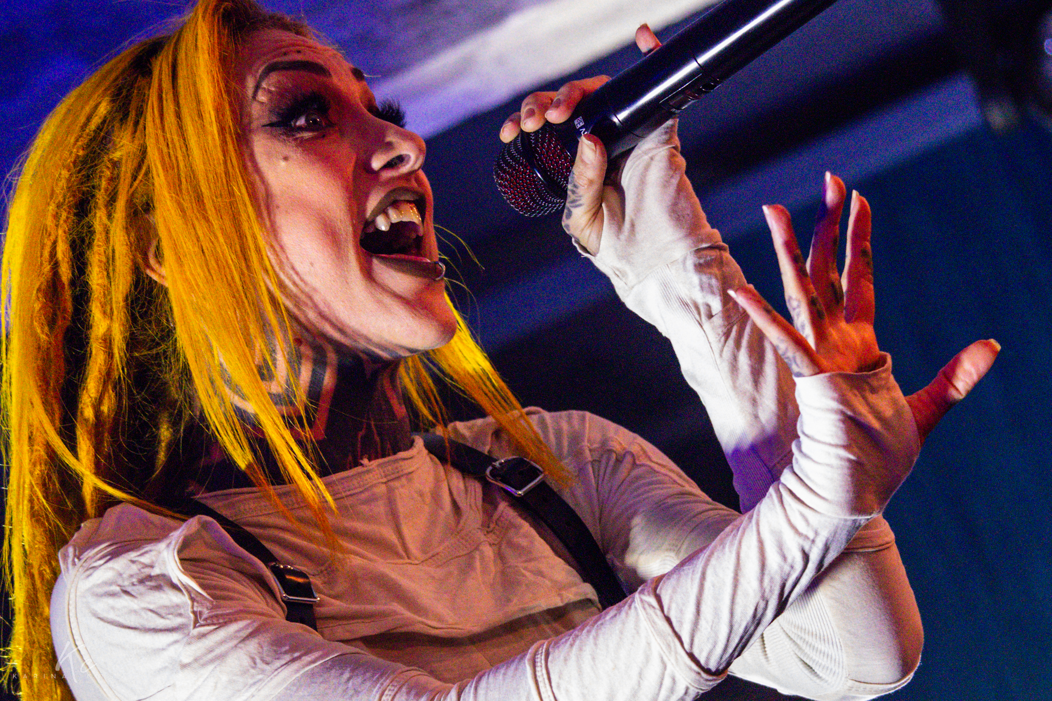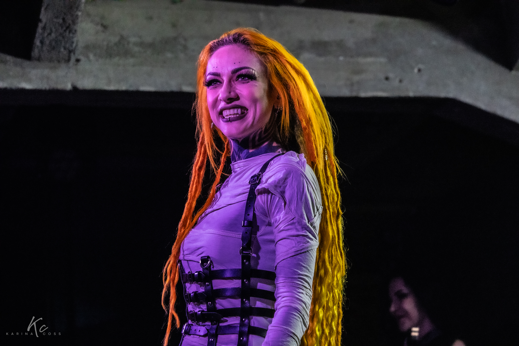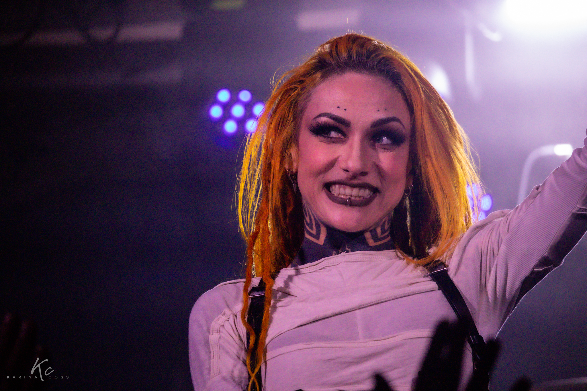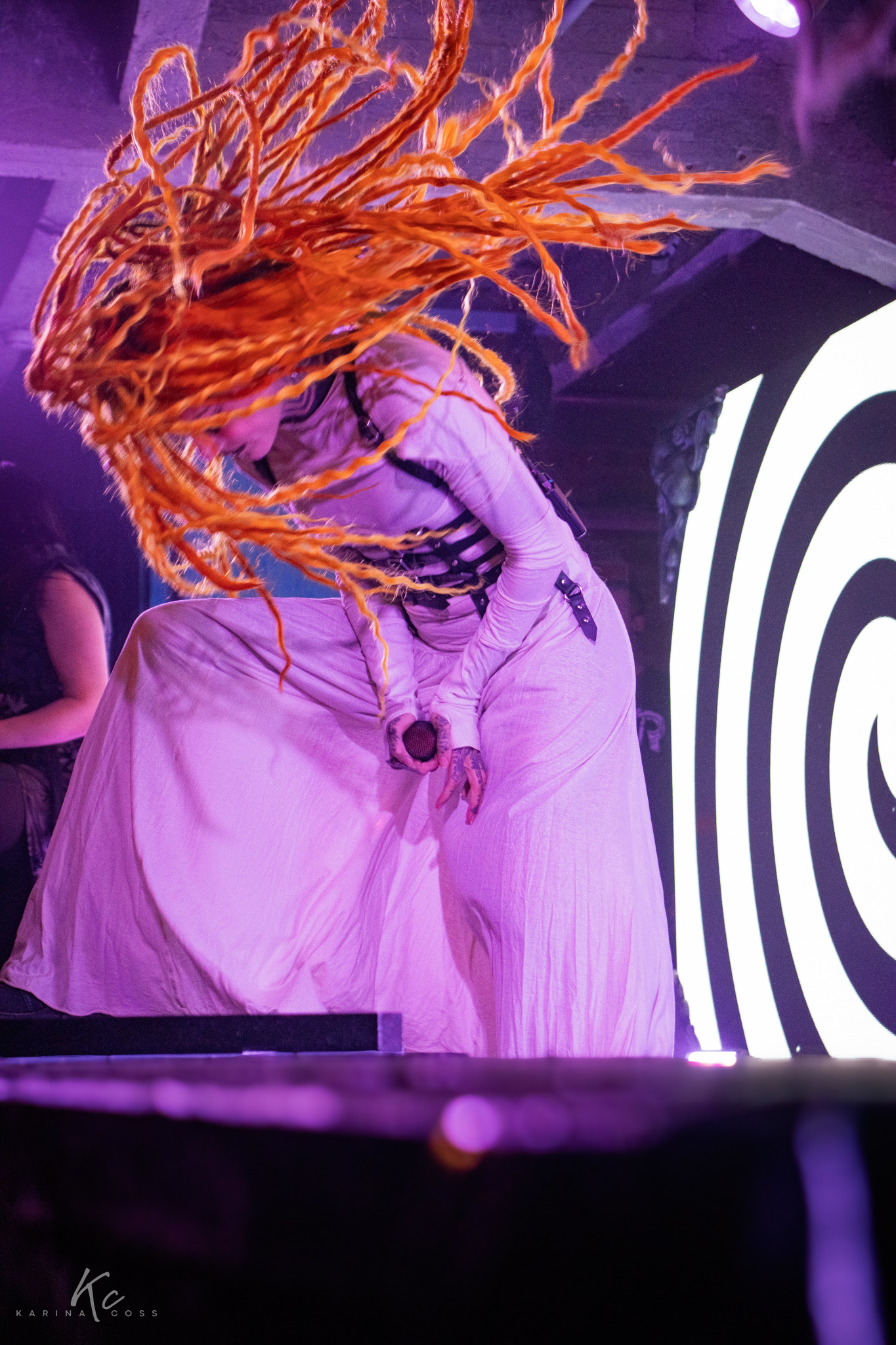 Lights, smoke, visuals—everything dialed in. At the center of it all, Lena Scissorhands moved like a force rather than a frontwoman: ethereal, sharp, impossible to ignore. White dress, black leather accents, orange dreadlocks—contrast turned into identity.