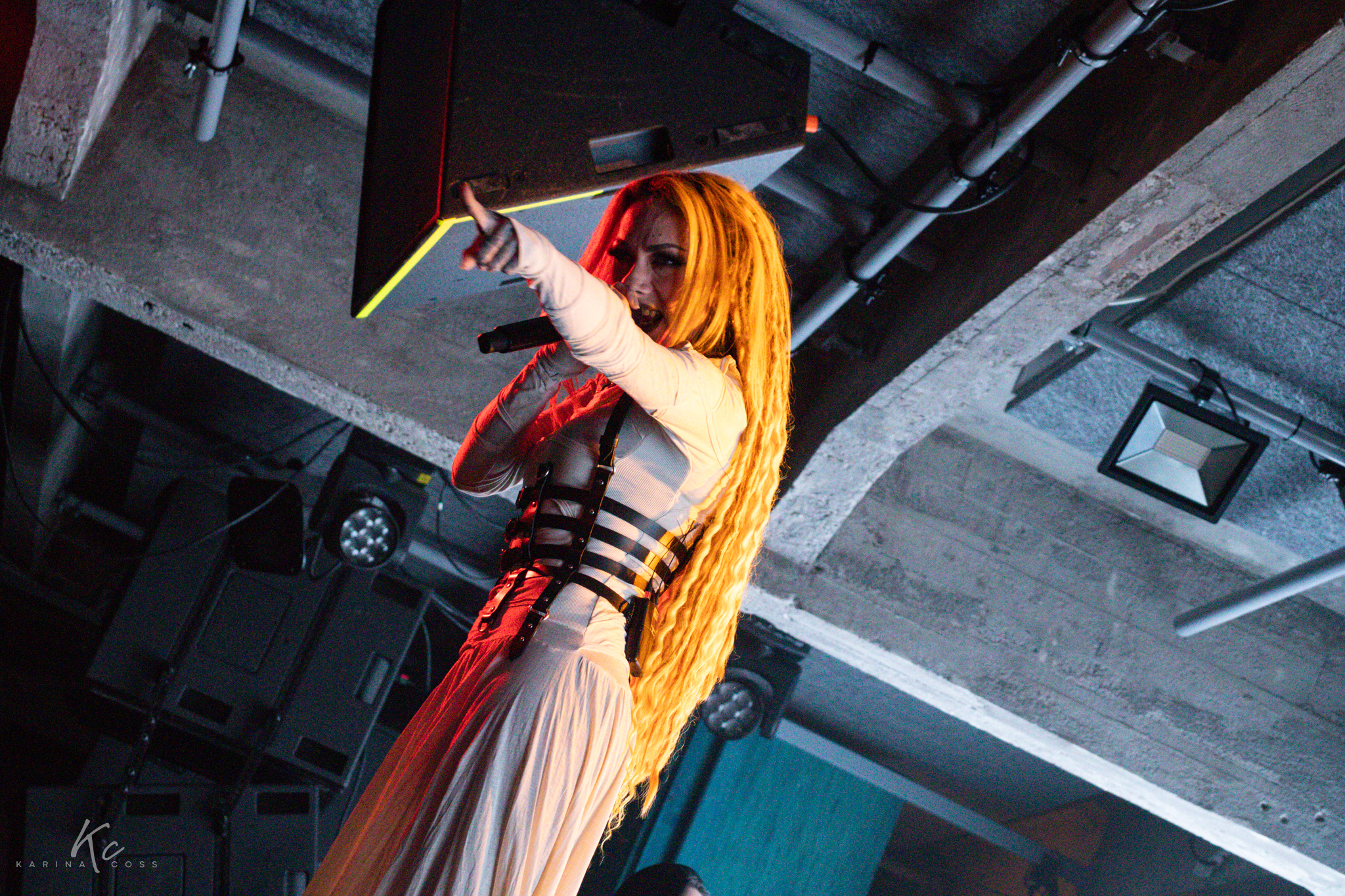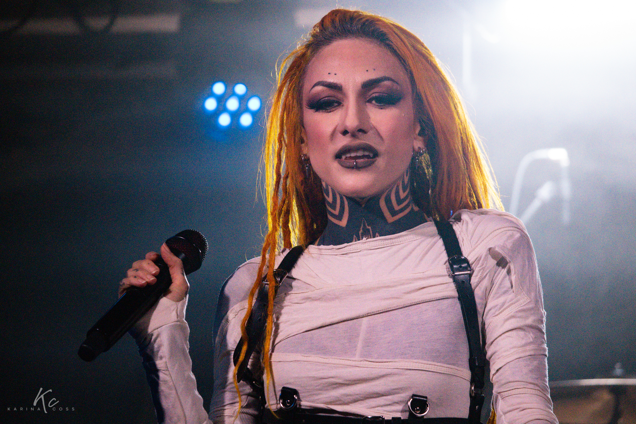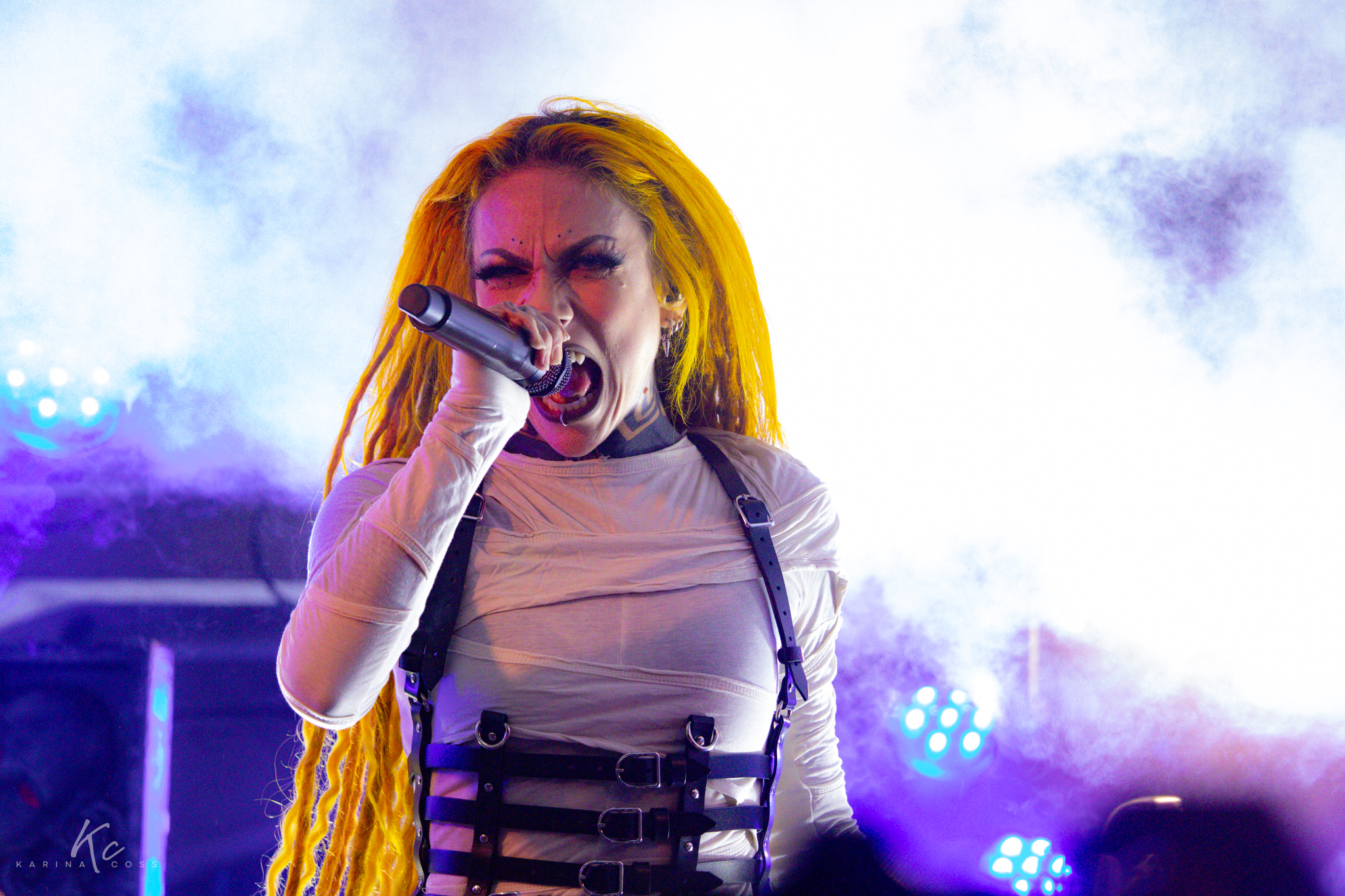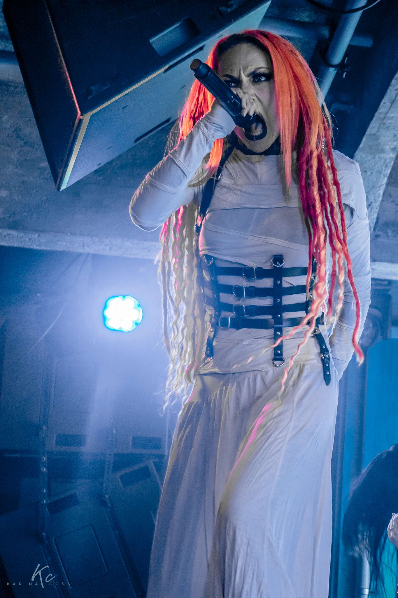 Lights, smoke, visuals—everything dialed in. At the center of it all, Lena Scissorhands moved like a force rather than a frontwoman: ethereal, sharp, impossible to ignore. White dress, black leather accents, orange dreadlocks—contrast turned into identity.