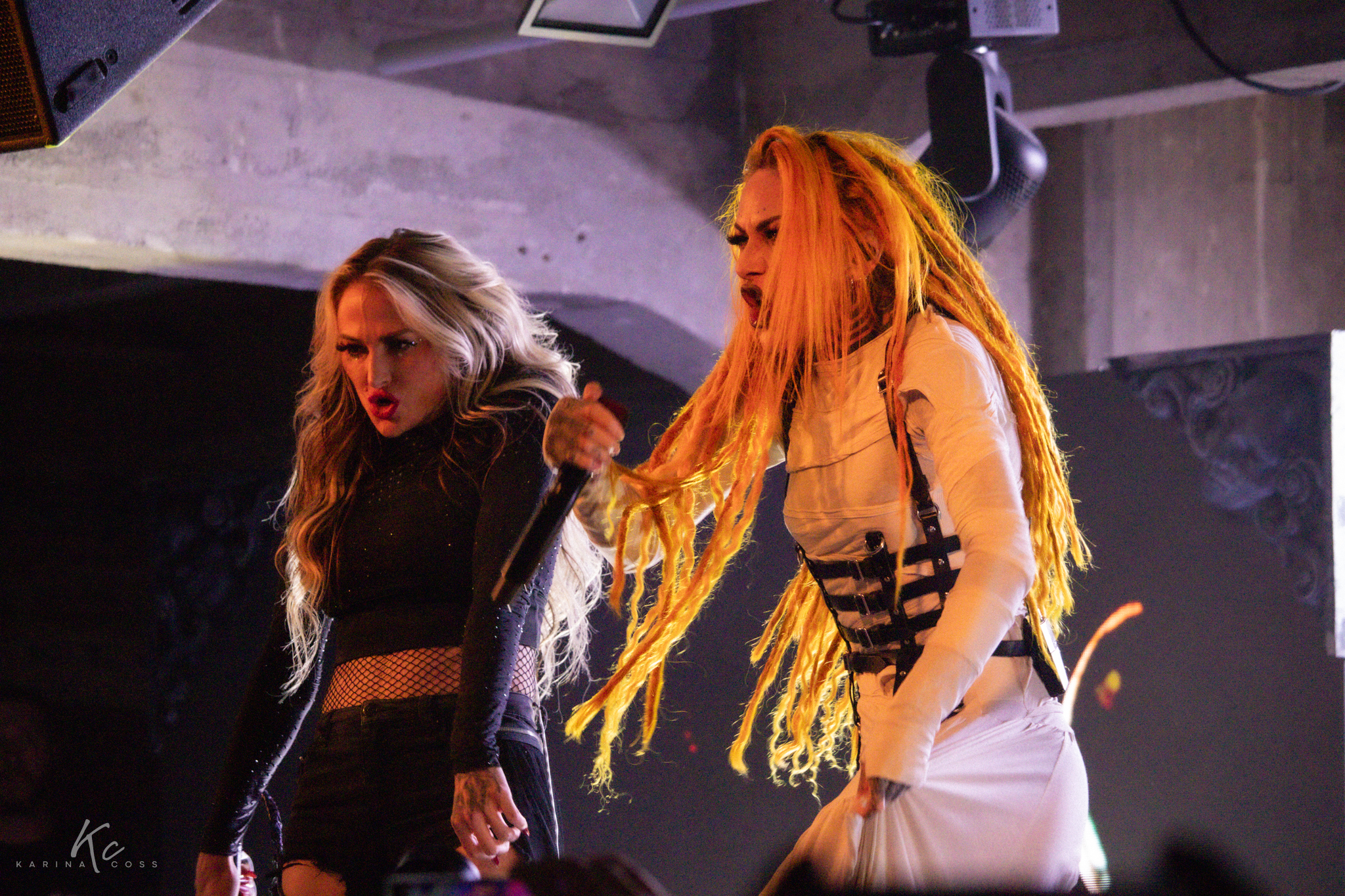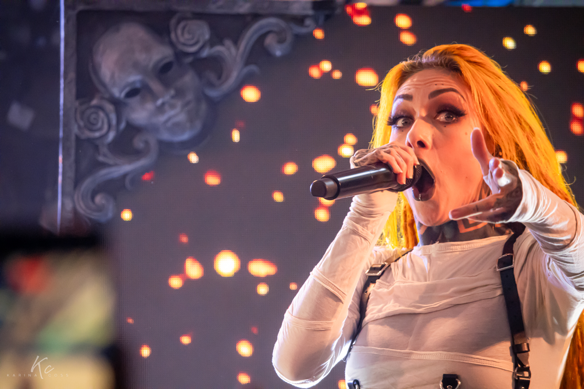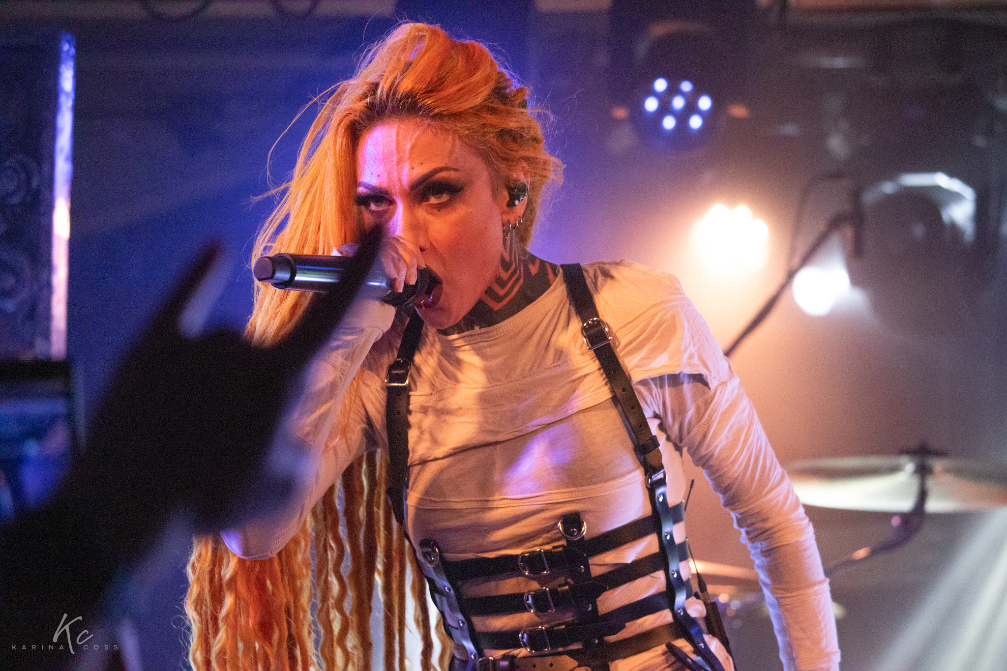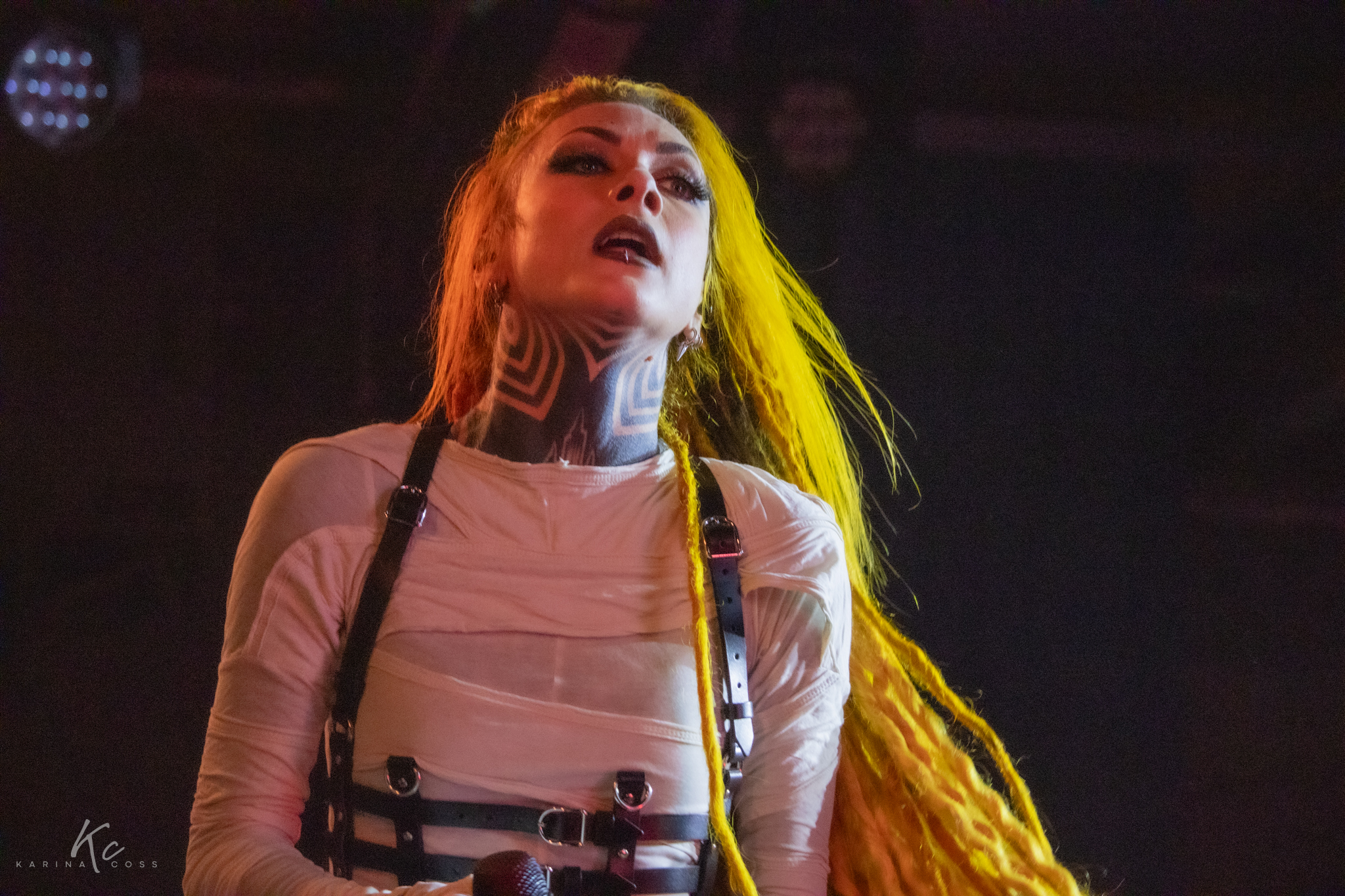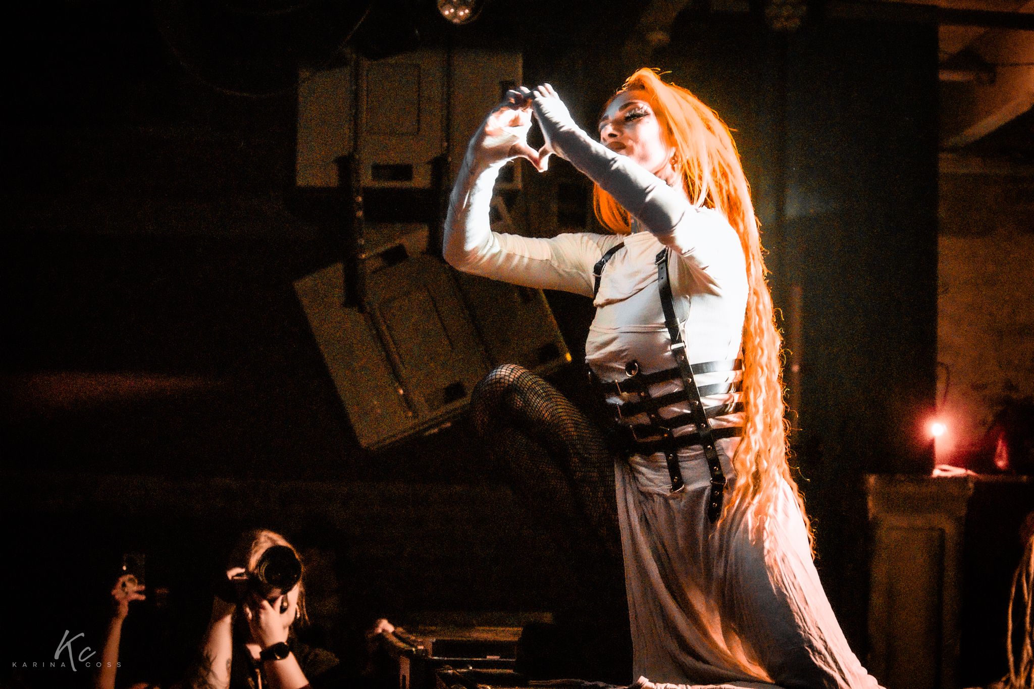 Lights, smoke, visuals—everything dialed in. At the center of it all, Lena Scissorhands moved like a force rather than a frontwoman: ethereal, sharp, impossible to ignore. White dress, black leather accents, orange dreadlocks—contrast turned into identity.