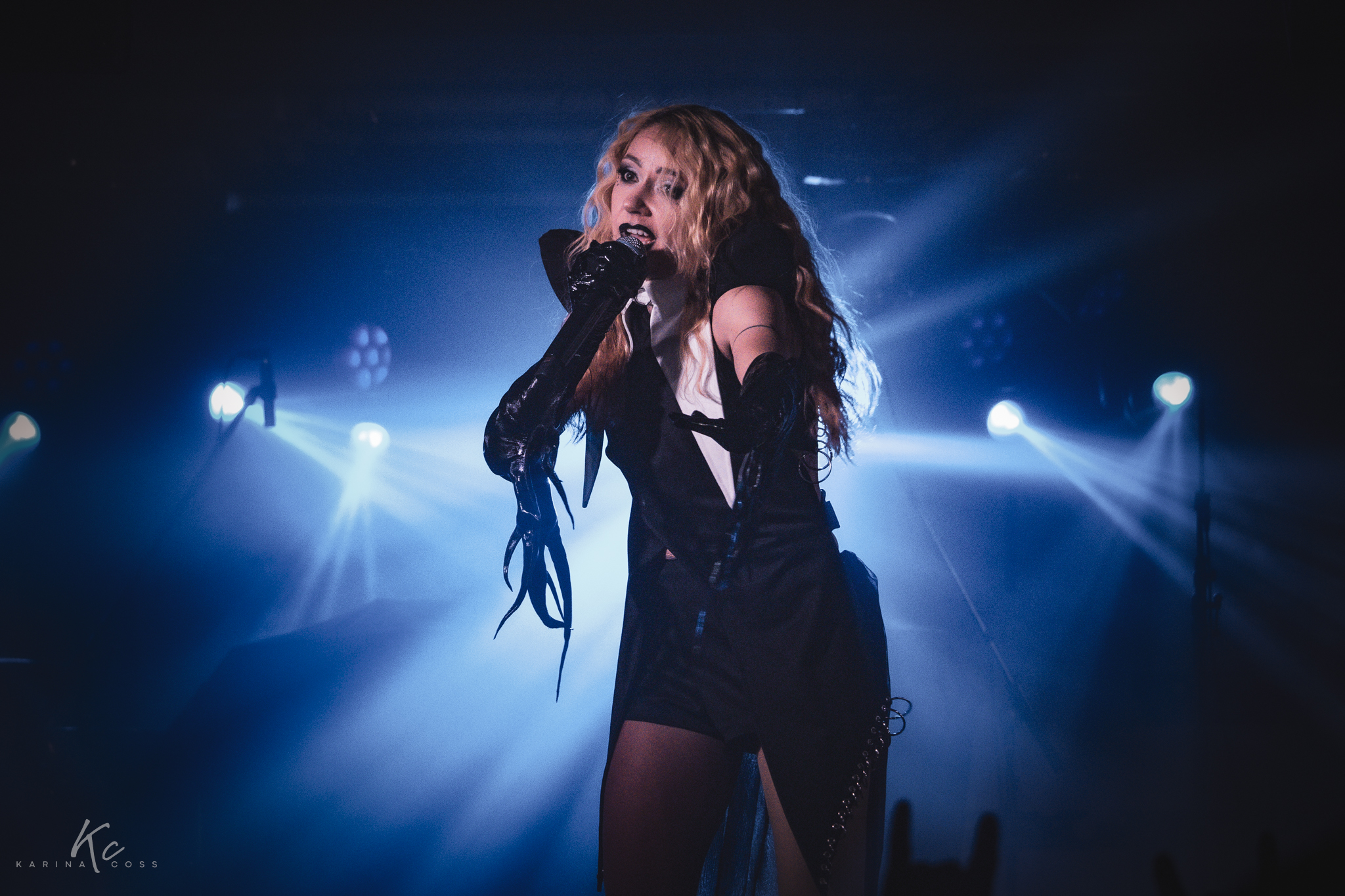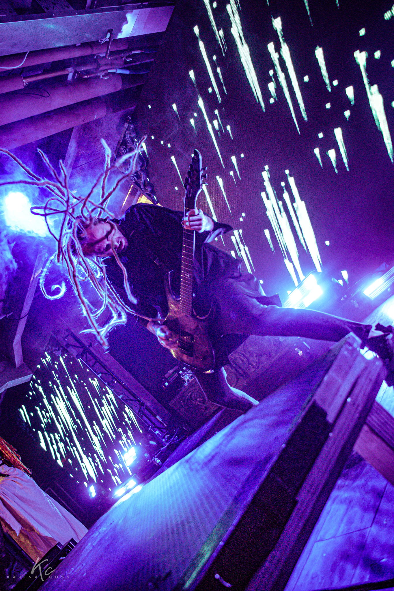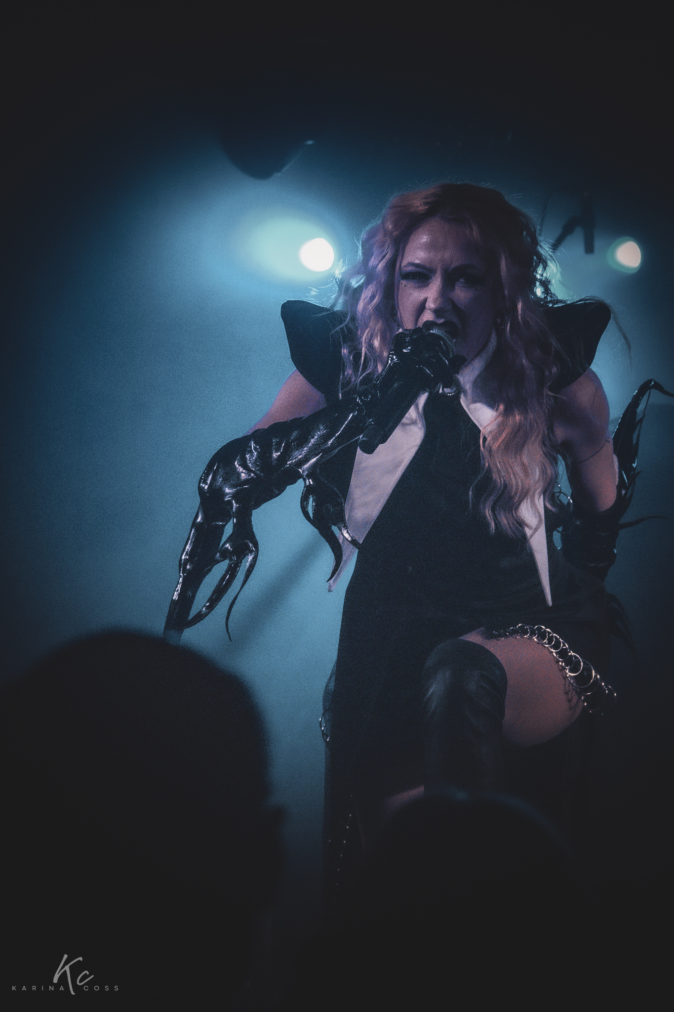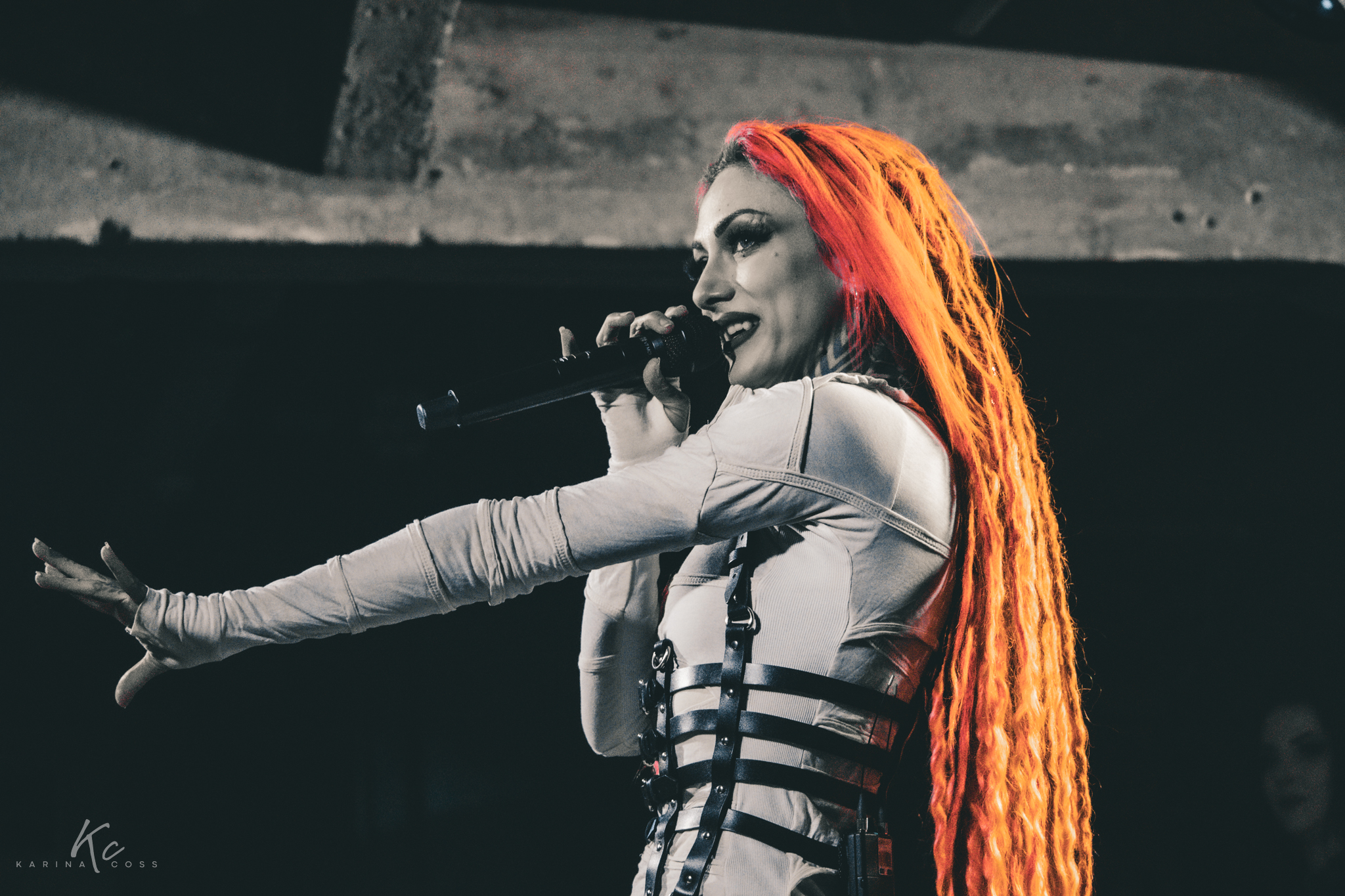 Lights, smoke, visuals—everything dialed in. At the center of it all, Lena Scissorhands moved like a force rather than a frontwoman: ethereal, sharp, impossible to ignore. White dress, black leather accents, orange dreadlocks—contrast turned into identity.